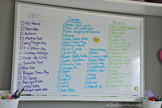The white board lists my current projects, to do queue, and other craft projects. This post reminded me to update it. Much prettier!