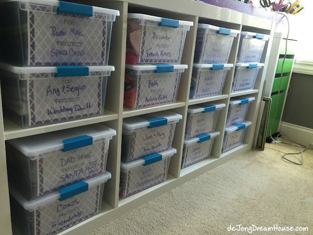 On the sewing side of my craft table, I have my UFOs. Each clip box includes a laminated project label with the recipient and description of the project. When I start think of a project, I get a bin and start putting in pattern (or patterns, if I'm not sure yet), fabric from my stash, and anything else that might go along with it.