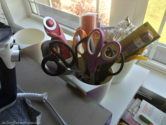 I love IKEA Bygel containers for storing little things. They're only 99 cents each! I keep my cutters, scissors, and tape measures on a this little file cabinet. The empty one is used for scraps when I'm cutting and trimming.